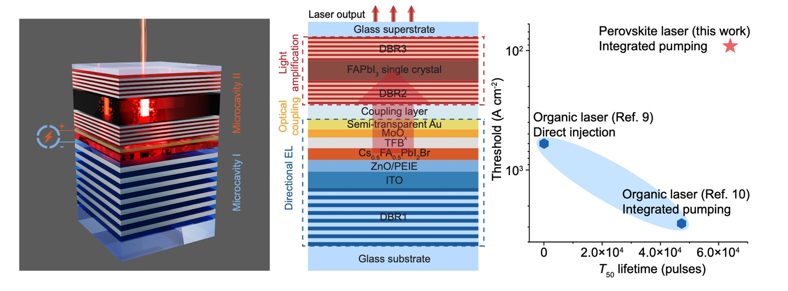 يقال إن الجهاز يجمع بشكل فعال عددًا كبيرًا من الفوتونات الناتجة عن بيروفسكايت LED ذو تجويف صغير متحمس كهربائيًا في تجويف صغير ثانٍ. وهناك، تم تحفيزهم بواسطة وسط كسب البيروفسكايت أحادي البلورة، مما أدى إلى توليد ليزر بكفاءة اقتران تصل إلى 82.7%. تيار البداية المطلوب لتشغيل ليزر أشباه الموصلات الجديد هذا هو 92 أمبير لكل سنتيمتر مربع، وهو أعلى بكثير من أفضل أجهزة الليزر العضوية التي تعمل بالكهرباء، ويظهر استقرارًا ممتازًا.