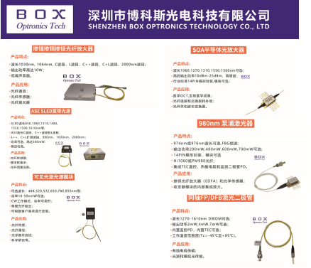 مكبرات الصوت الضوئية لأشباه الموصلات SOA: الأطوال الموجية 1060، 1270، 1310، 1550، 1560 نانومتر قابلة للتحديد، طاقة الخرج 10dBm-25dBm، مكاسب عالية، شكل ضوضاء منخفض، مناسبة لـ OCT الطبي، والتصوير الطبي الحيوي، ووصلات الألياف الضوئية وتعويض فقدان التبديل، والمفاتيح الضوئية، ومحولات الطول الموجي.