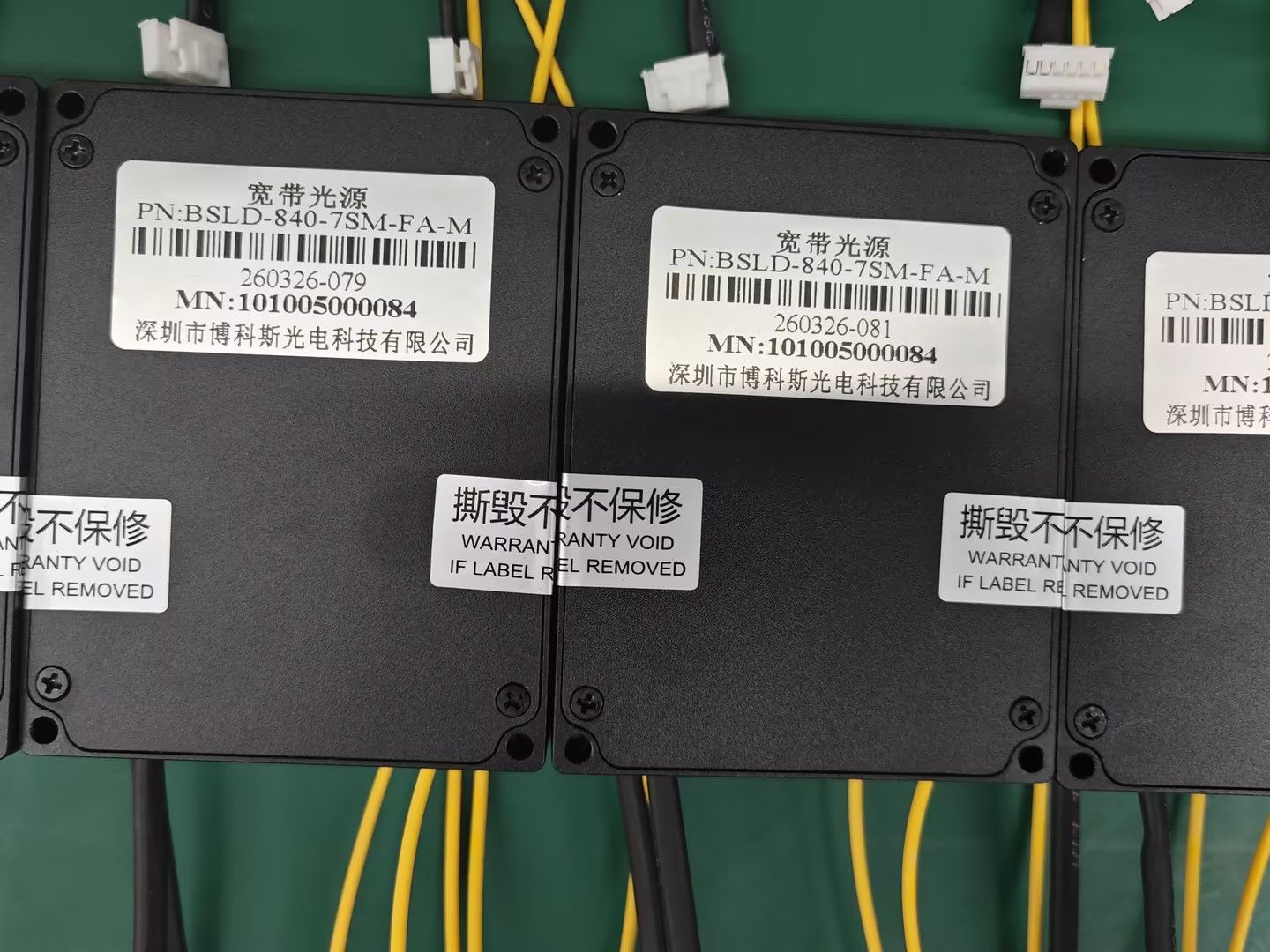 ● المنتج الأساسي:وحدات مصدر ضوء النطاق العريض التي تم شحنها هذه المرة هي نموذجيةBSLD-840-7SM-FA-M، تتميز بمخرج طيفي واسع، وثبات عالي للطاقة، وخسارة منخفضة تعتمد على الاستقطاب، مما يجعلها مثالية لتطبيقات مثل استشعار الألياف الضوئية، والاختبار البصري، والطب الحيوي.